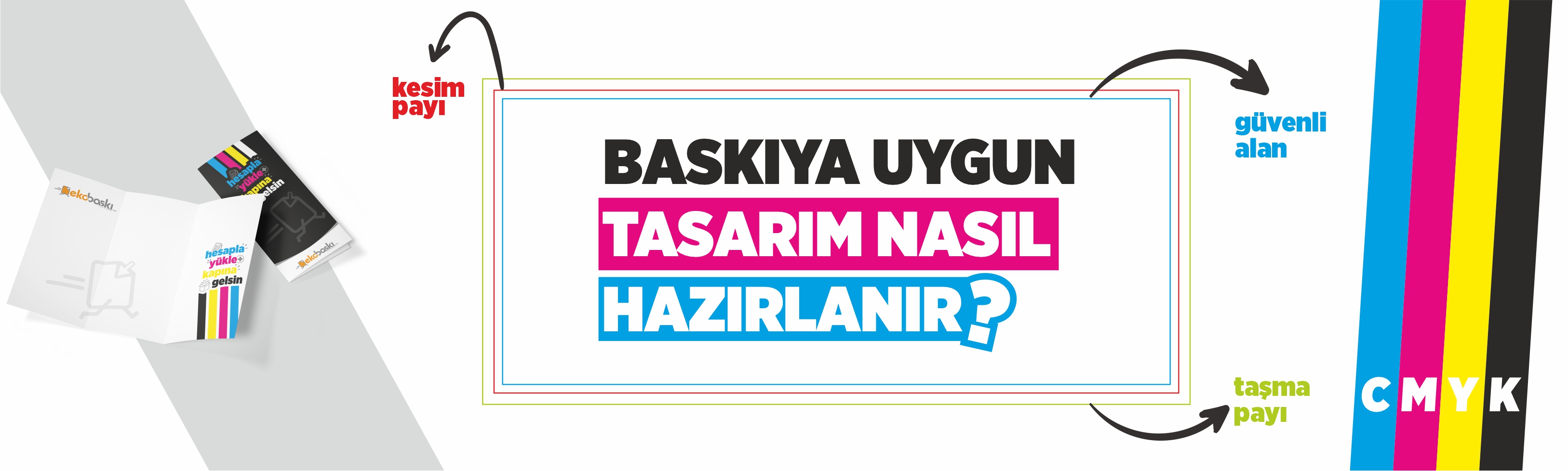 Baskı ürünleri için tasarımınızı hazırlarken bilmeniz gereken 3 farklı alan bulunuyor. Taşma payı; tasarımın en dışında bulunan 3 mm boyutundaki çerçeve alanıdır. Bu alan kağıdın baskı sonrası kesilecek olan kısmıdır ve bu nedenle de bu alan ürün tasarımının boyutuna ek olarak eklenmelidir. Örneğin; ürün boyutu 133 x 194 mm ise taşma payı ile beraber tasarımın boyutu 139 x 200 mm olmalıdır. Kesim çizgisinden iç tarafa doğru olan 5 mm genişliğindeki alan dışında kalan alan ise güvenli alanı oluşturur. Yani, taşma payından sonra gelen kesim çizgisinden sonraki 5 mm’lik alan içerisine logo veya metin yerleştirilmemelidir.